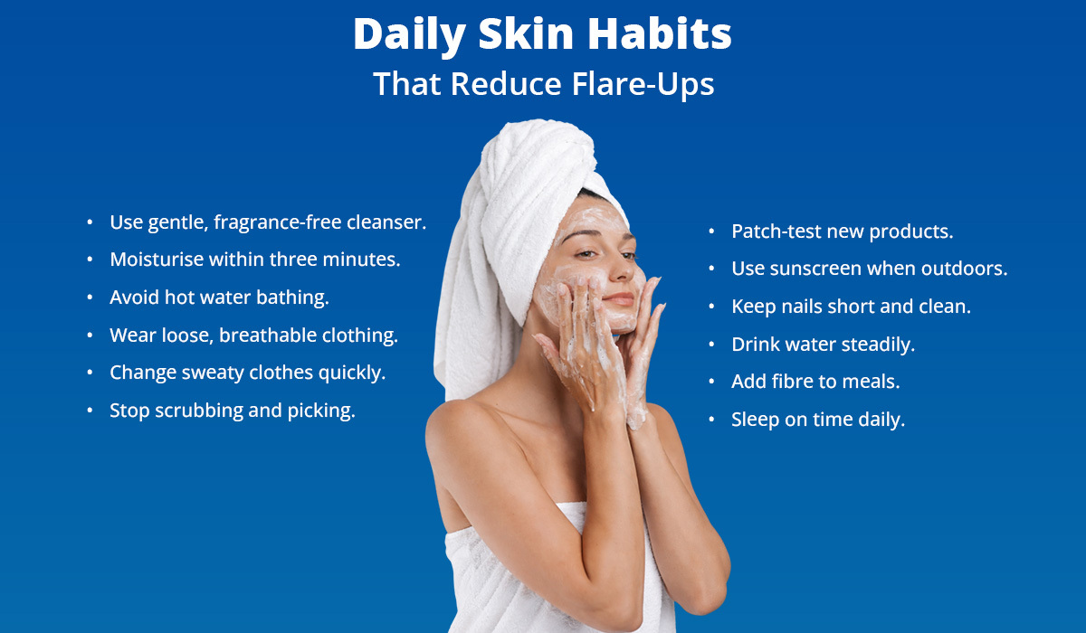 - Evening: Short bath, moisturise immediately, change pillow covers regularly.